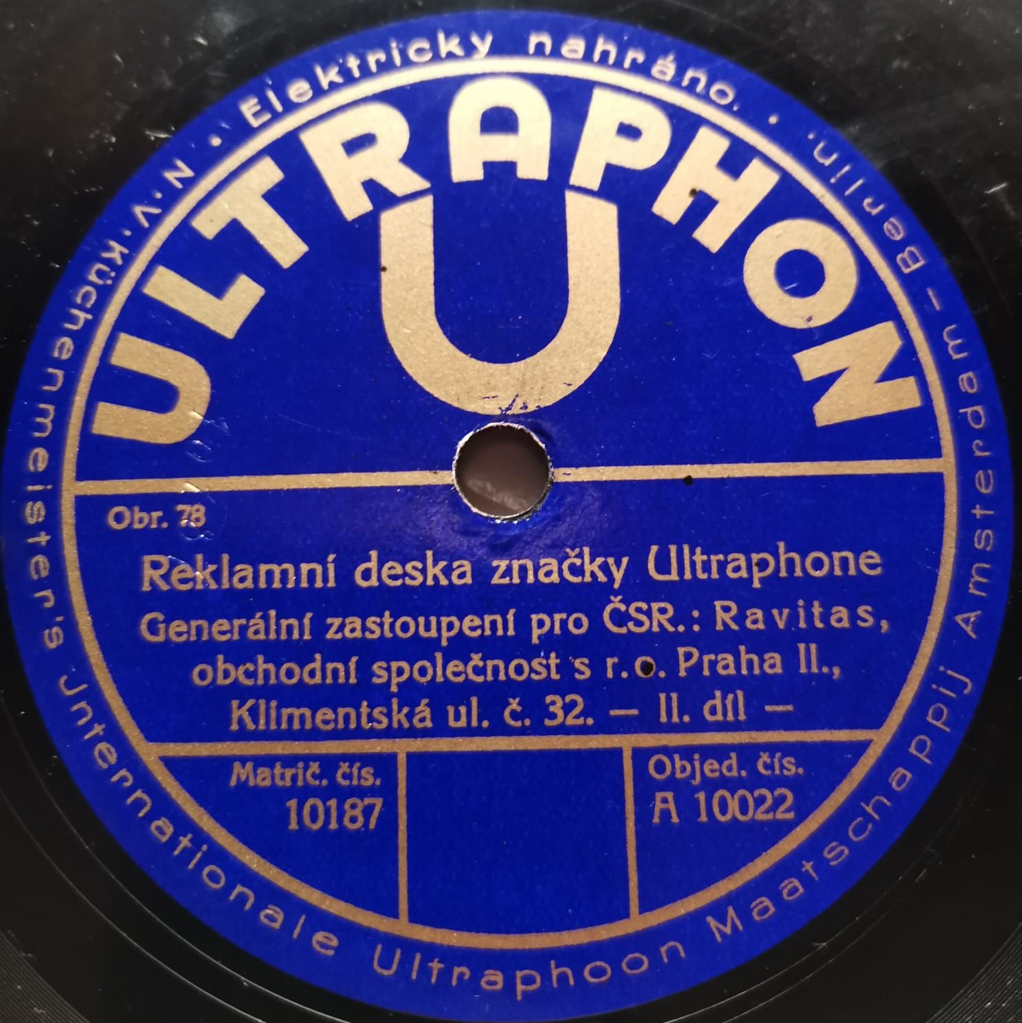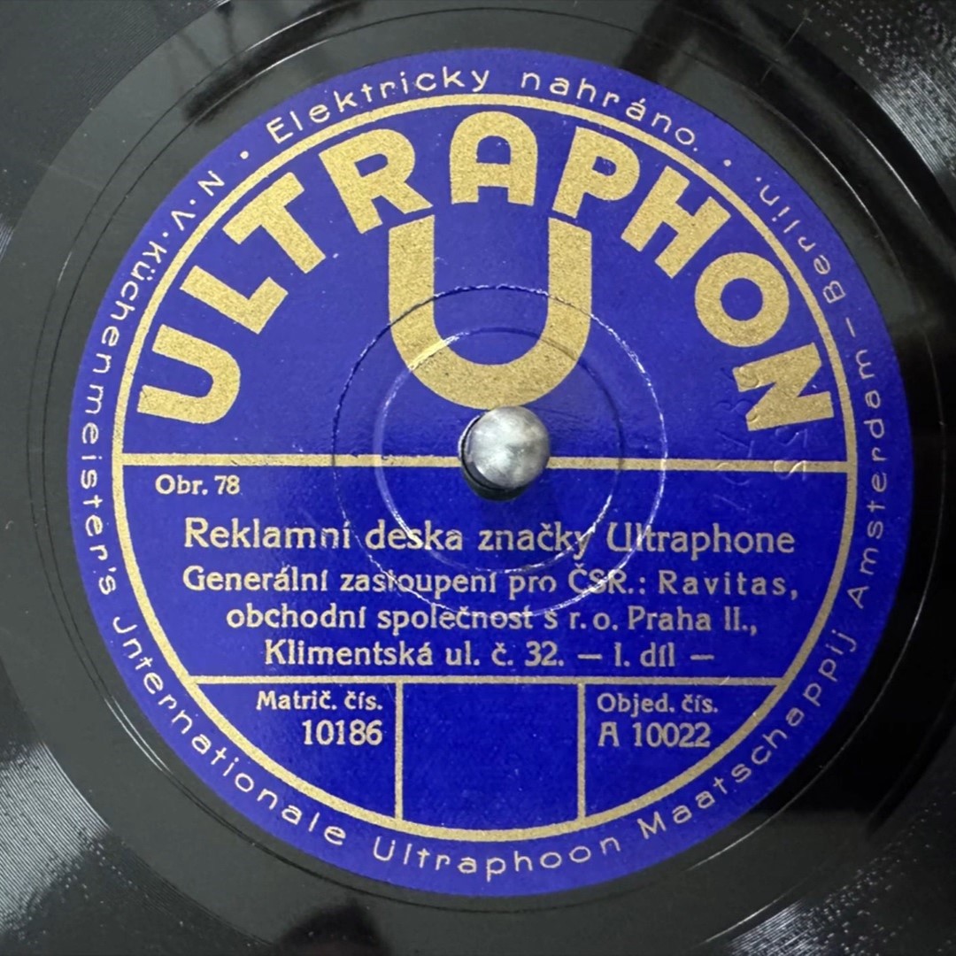 Menej vídaná reklamná platňa Ultraphonu o získaní generálneho zastúpenia pre ČSR tejto pôvodne nemecko-holandskej spoločnosti. Text narozprával známy český herec Antonín Holzinger (1891 - 1954). Na druhej strane platne s objednávacím číslom A 10022 je foxtrot českého skladateľa, dirigenta a klaviristu F. A. Tichého (1898 - 1971) s názvom Dobrou noc (Černošská ukolébavka), ktorý nahral Ultraphon Jazz orchester pod dirigentskou taktovkou samotného autora. Obe nahrávky vznikli v novembri 1929 v Berlíne.