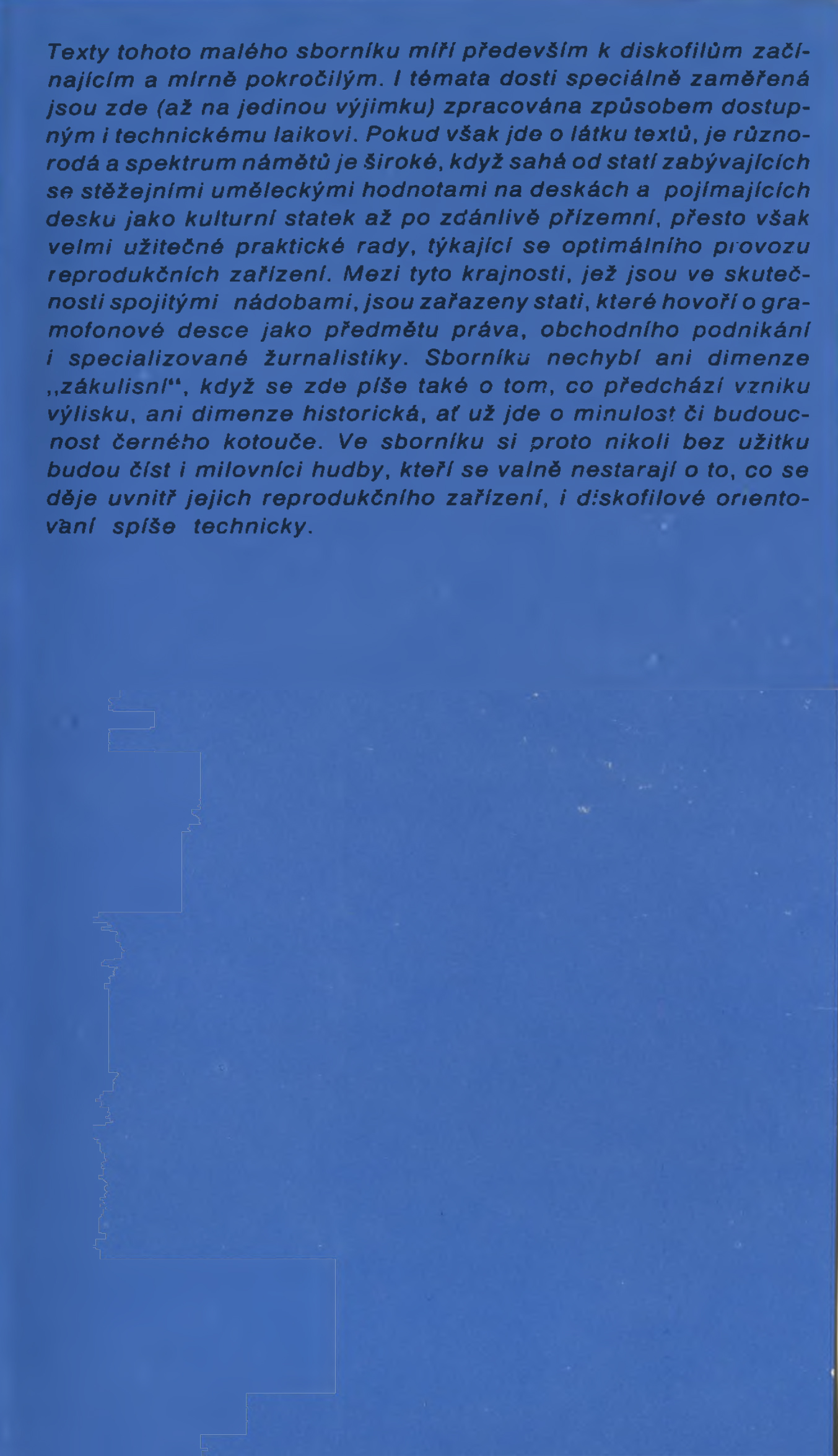Texty tohto malého zborníka mieria predovšetkým k diskofilom začínajúcim a mierne pokročilým. Aj témy dosť špeciálne zamerané sú tu (až na jedinú výnimku) spracované spôsobom dostupným aj technickému laikovi. Pokiaľ však ide o látku textov, je rôznorodá a spektrum námetov je široké, keď siaha od statí zaoberajúcich sa s hlavnými umeleckými hodnotami na doskách a pojímajúcich dosku ako kultúrny statok až po zdanlivo prizemnú, napriek tomu však veľmi užitočné praktické rady, týkajúce sa optimálnej prevádzky reprodukčných zariadení. Medzi tieto krajnosti, ktoré sú v skutočnosti spojitými nádobami, sú zaradené stati, ktoré hovoria o gramofónovej doske ako predmetu práva, obchodného podnikania aj špecializované žurnalistiky. Zborníku nechýbajú ani dimenzie ,,zákulisné", keď sa tu píše aj o tom, čo predchádza vzniku výlisku, ani dimenzia historická, a ( už ide o minulosť či budúcnosť čierneho kotúča. V zborníku si preto nie bez úžitku budú čítať aj milovníci hudby, ktorí sa valne nestarajú o to, čo sa deje vo vnútri ich reprodukčného zariadenia, aj diskofilové orientovaní skôr technicky.