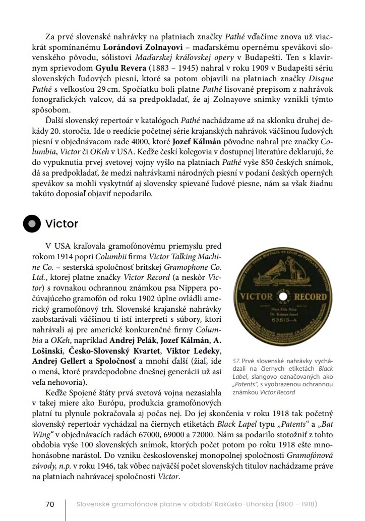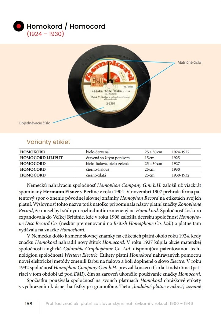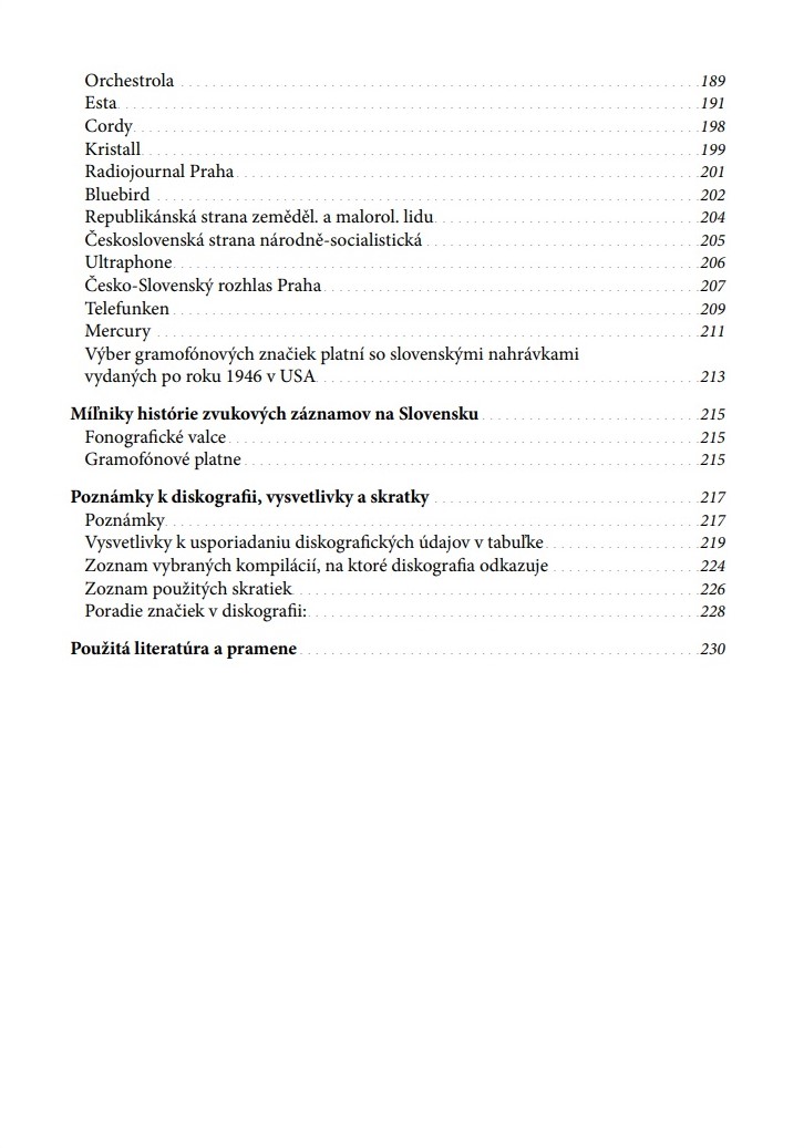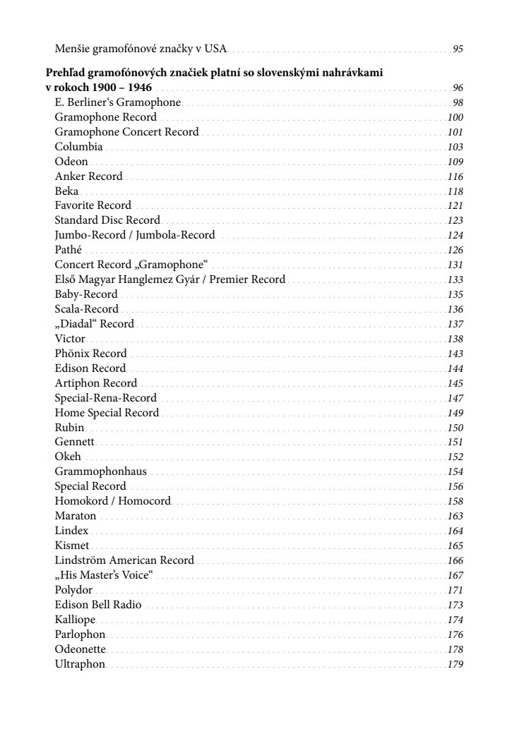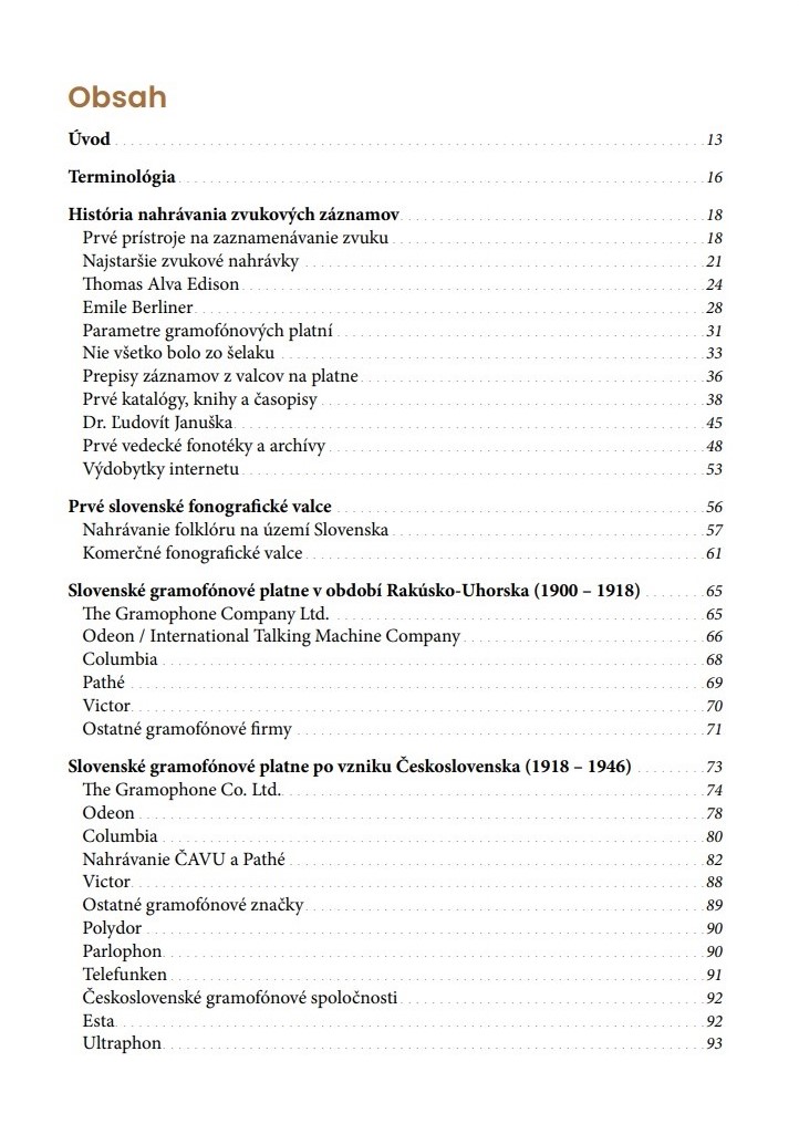 The main part of the publication was originally supposed to consist of a unique, previously non-existent, comprehensive list of all Slovak gramophone recordings recorded between 1900 and 1946. After much consideration, with a view to saving the environment and minimizing the already high costs of publishing a book, this extensive list is being published "only" in the form of an electronic appendix. The book also provides an insight into the history of recording sound recordings in the world and in Slovakia, maps the development of the gramophone industry in our country during the Austro-Hungarian Empire and after the establishment of Czechoslovakia, and presents all gramophone brands and their labels on which Slovak repertoire appeared during this period in a richly illustrated chronological overview.